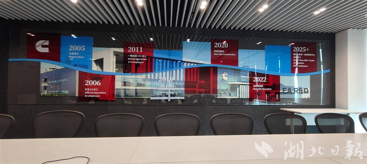 ▲康明斯東亞研發(fā)中心會議室內(nèi),展示該中心發(fā)展歷程中重要節(jié)點。湖北日報全媒記者 汪洋 攝