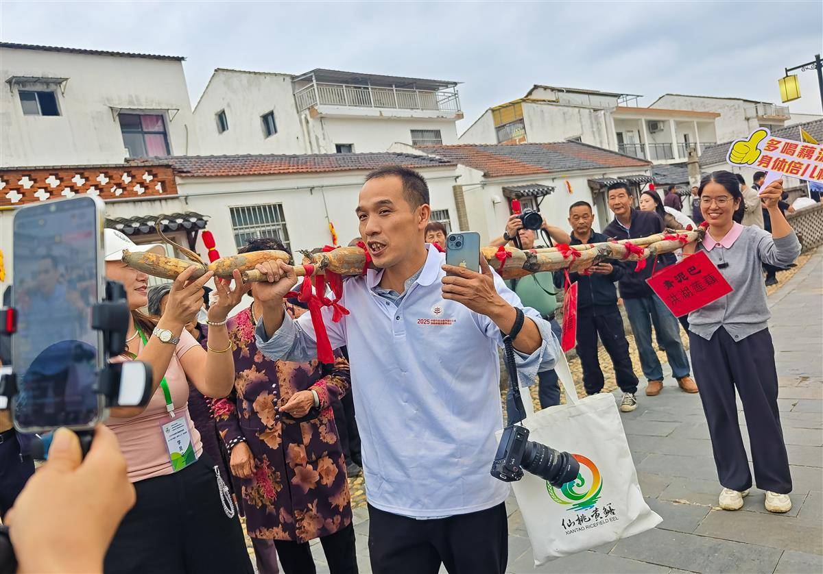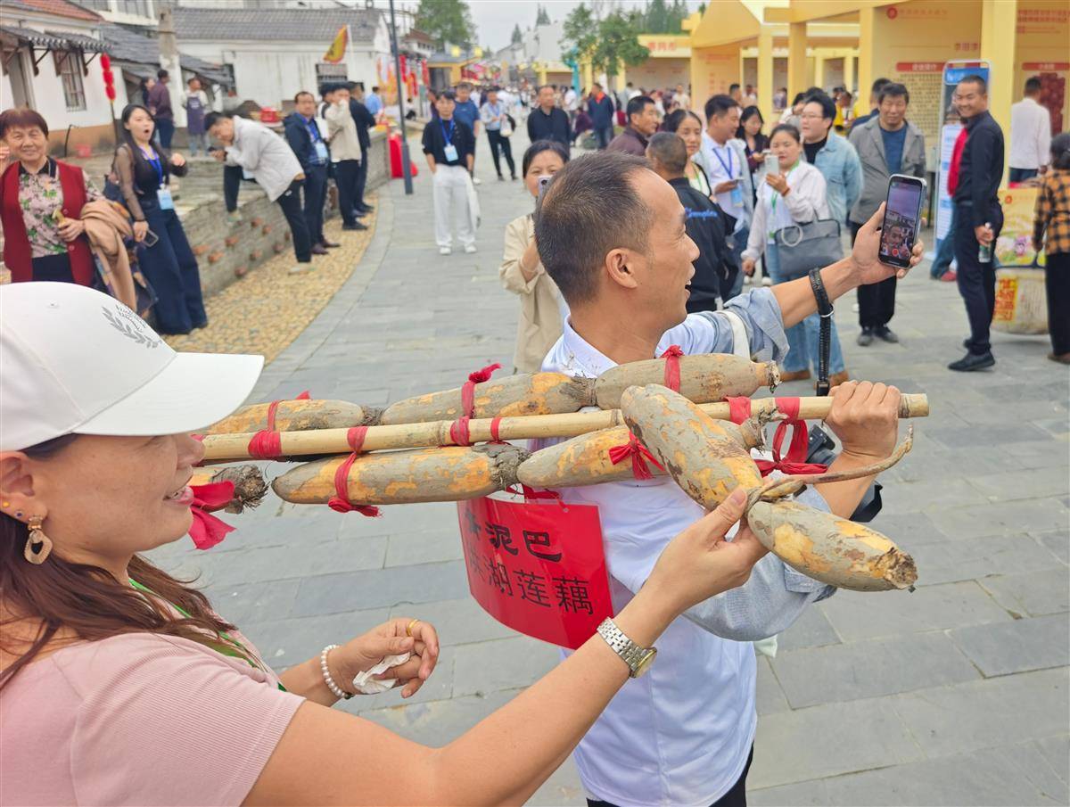 9月23日,2025中國農民豐收節湖北主場·仙桃黃鱔消費季活動在仙桃市排湖密塘漁村隆重舉行。來自洪湖青泥巴蓮藕合作社的藕農帶來3米多長的蓮藕,引得現場觀眾伸手觸摸,沾好運。(湖北日報全媒記者 柯皓 攝)