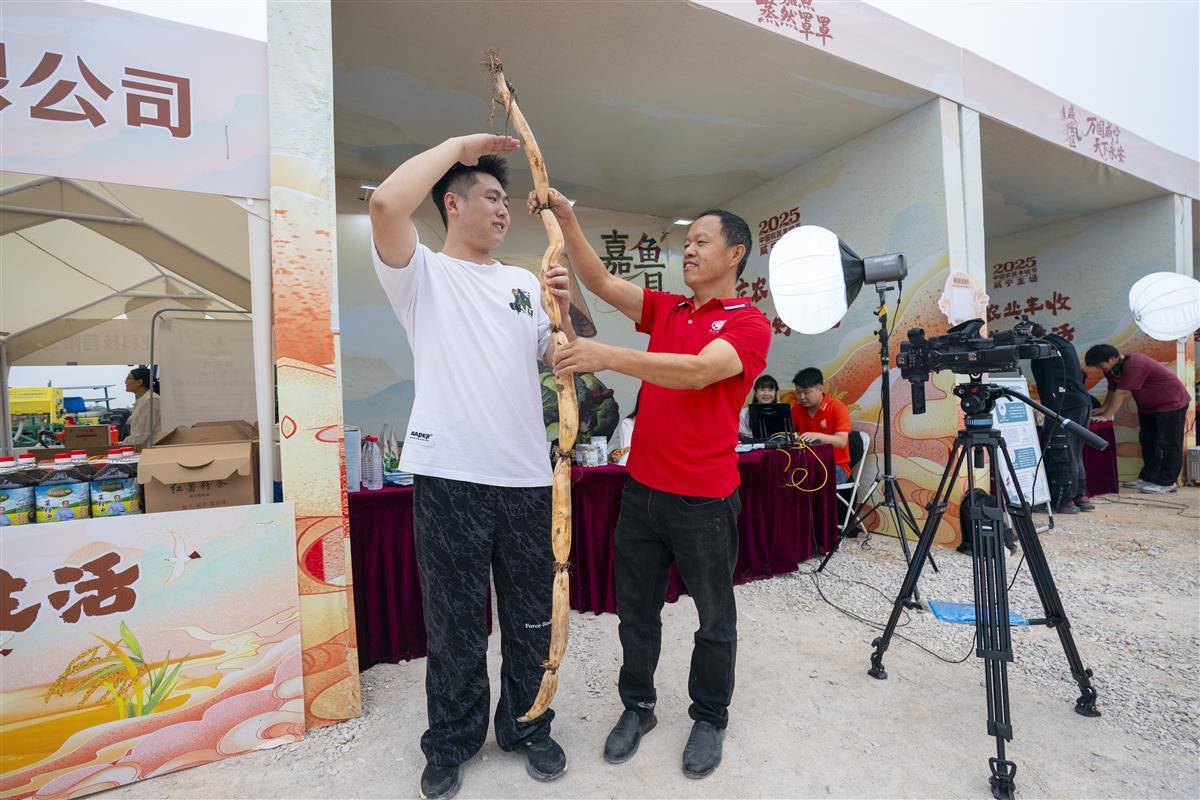 9月23日,嘉魚縣渡普鎮(zhèn)煙墩村,2025年中國農(nóng)民豐收節(jié)咸寧主場活動現(xiàn)場,藕農(nóng)展示一根長達(dá)2米的蓮藕。當(dāng)日,來自咸寧各地的農(nóng)民代表歡聚一堂慶祝豐收節(jié)。活動現(xiàn)場,特色文藝演出、趣味運(yùn)動、農(nóng)文旅直播、農(nóng)貿(mào)市集、豐收繪畫展、農(nóng)機(jī)展示、特色農(nóng)產(chǎn)品展示、互動體驗等單元,既體現(xiàn)了6個縣(市、區(qū))各自特色,又充分展現(xiàn)咸寧農(nóng)耕大地的豐碩成果。據(jù)統(tǒng)計,嘉魚縣蓮藕種植面積達(dá)6.38萬畝,其中蓮藕種植面積3多萬畝,年產(chǎn)鮮藕6萬噸,蓮藕產(chǎn)業(yè)綜合產(chǎn)值高達(dá)10億元。(湖北日報全媒記者 魏錸 攝)