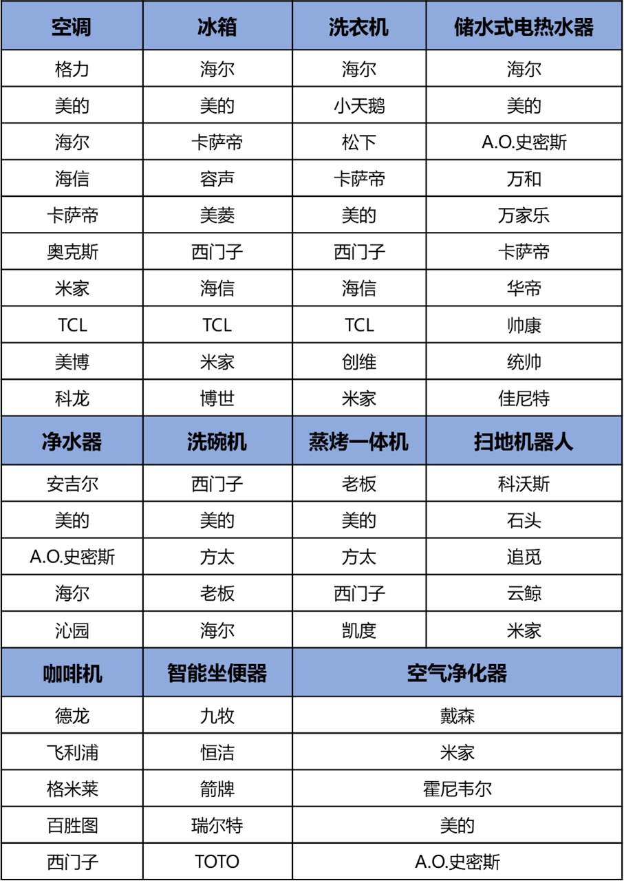據了解,本屆評價共有空調、冰箱、洗衣機、儲水式電熱水器4大類各10個品牌,凈水器、洗碗機、蒸烤一體機、掃地機器人、咖啡機、智能坐便器、空氣凈化器7大類各5個品牌入選。