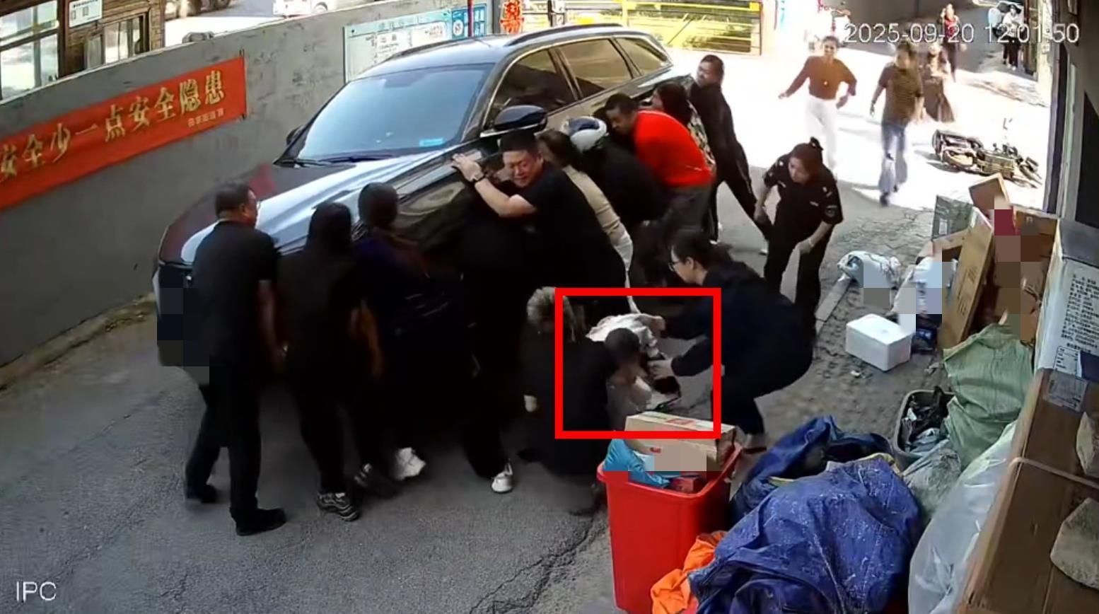 根據(jù)監(jiān)控視頻,事發(fā)時(shí)間為9月20日12時(shí)許。視頻畫面顯示,一名男童蹲在較窄的道路上玩耍,被一輛SUV汽車撞倒,腿部被輪胎碾軋。一旁商鋪有人沖出來(lái)拍打車窗后,迅速查看孩子的情況。畫面中,十幾名路人瞬間匯聚到肇事車輛旁,約50秒后,眾人抬起汽車,將孩子救出。女性司機(jī)也下車參與了救人。