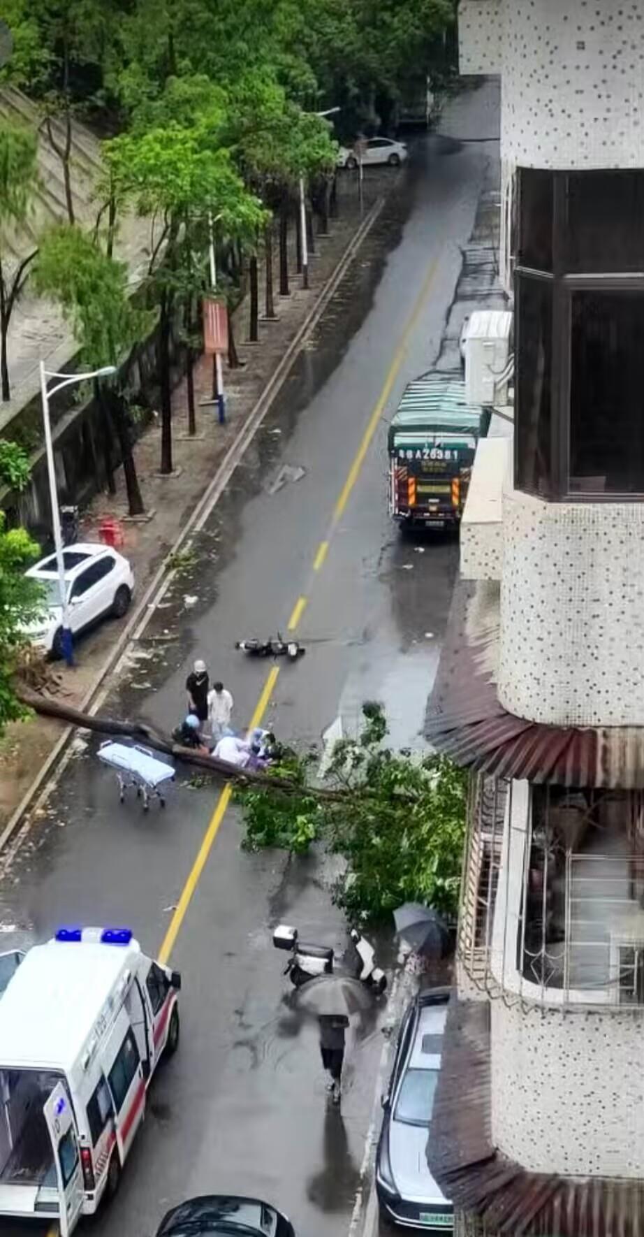 事發(fā)于上午8時(shí)50分。路邊監(jiān)控視頻顯示,當(dāng)時(shí)正下著小雨,一名男子正騎車經(jīng)過大嶺古街,突然路邊一棵大樹倒下,正好砸中男子。救護(hù)車趕到后,將男子送醫(yī)。