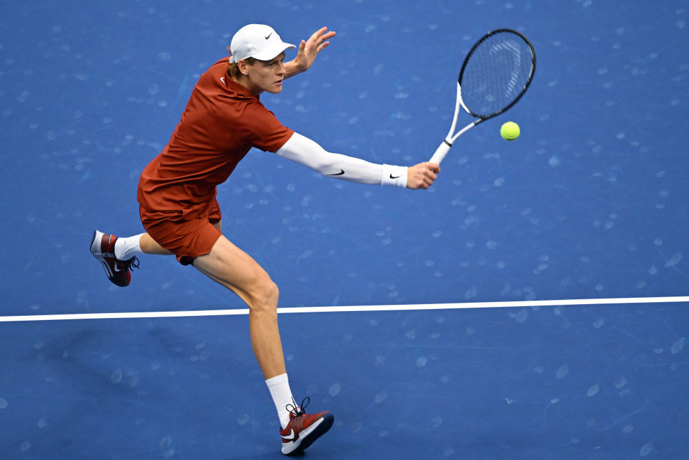9月7日,辛納在比賽中回球。當日,在2025美國網球公開賽男子單打決賽中,西班牙選手阿爾卡拉斯3比1戰勝意大利選手辛納,獲得冠軍。新華社記者 李睿 攝