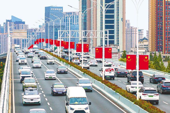 9月23日,武漢常青大道高架橋上懸掛了數百面五星紅旗。國慶佳節臨近,武漢街頭一抹抹鮮艷的中國紅,烘托出喜慶的節日氛圍。(湖北日報全媒記者 任勇 攝)
