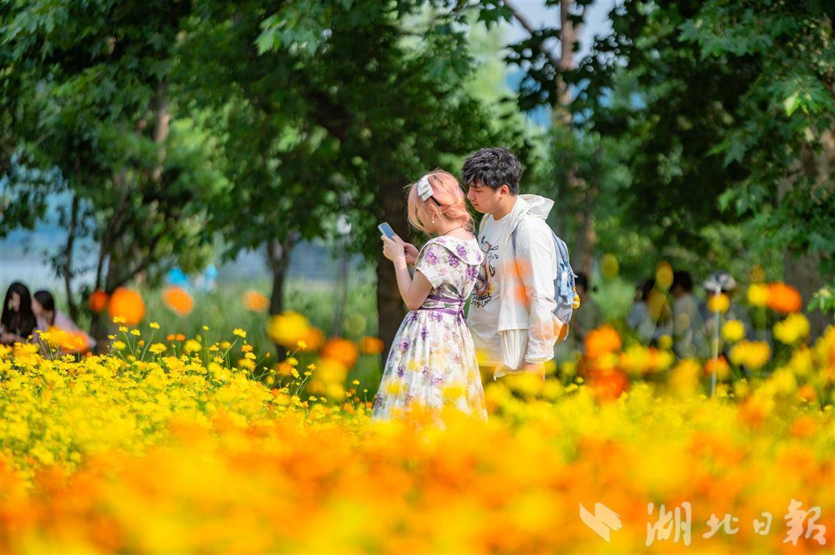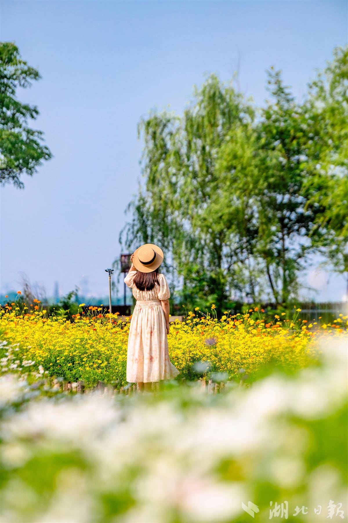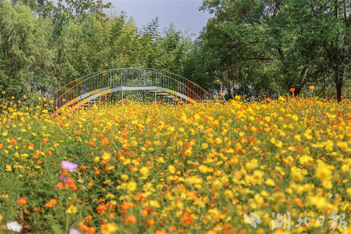 5000平方米的湖光花海正值盛花期,硫華菊與百日草交織成繽紛海洋。