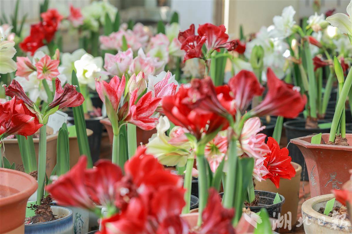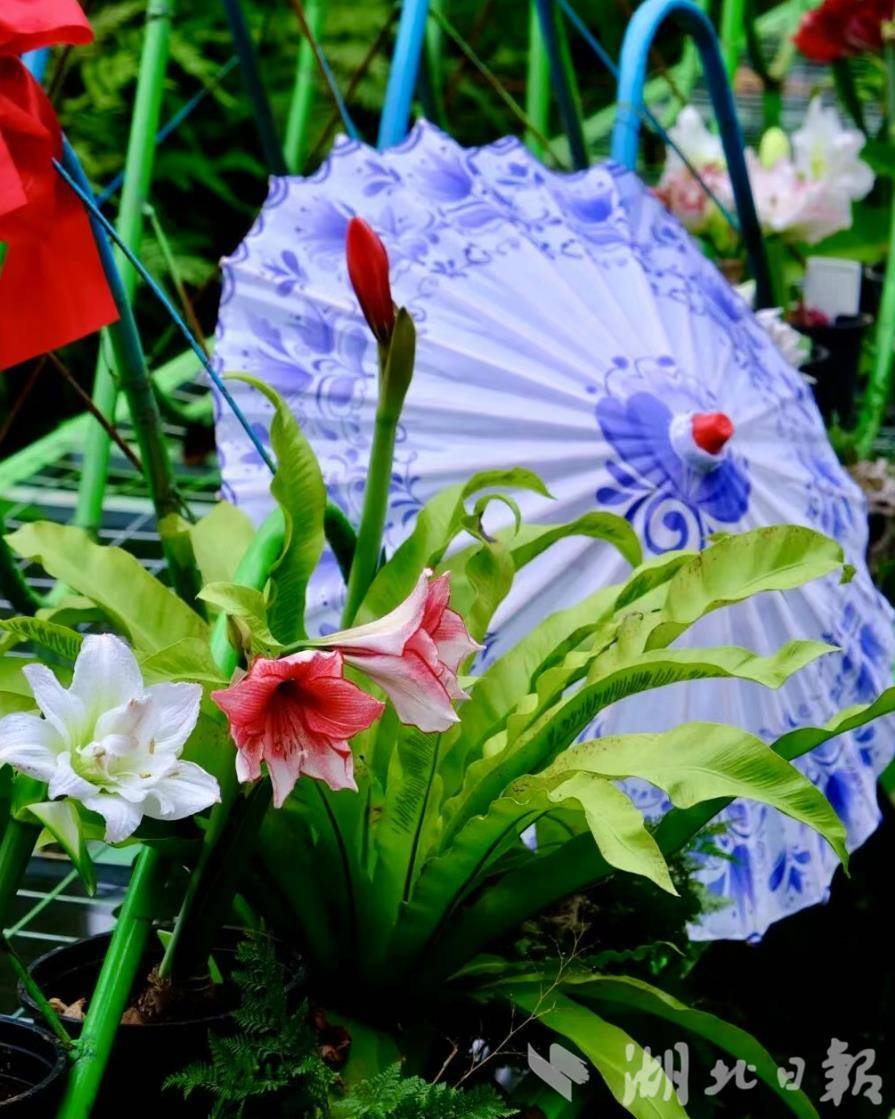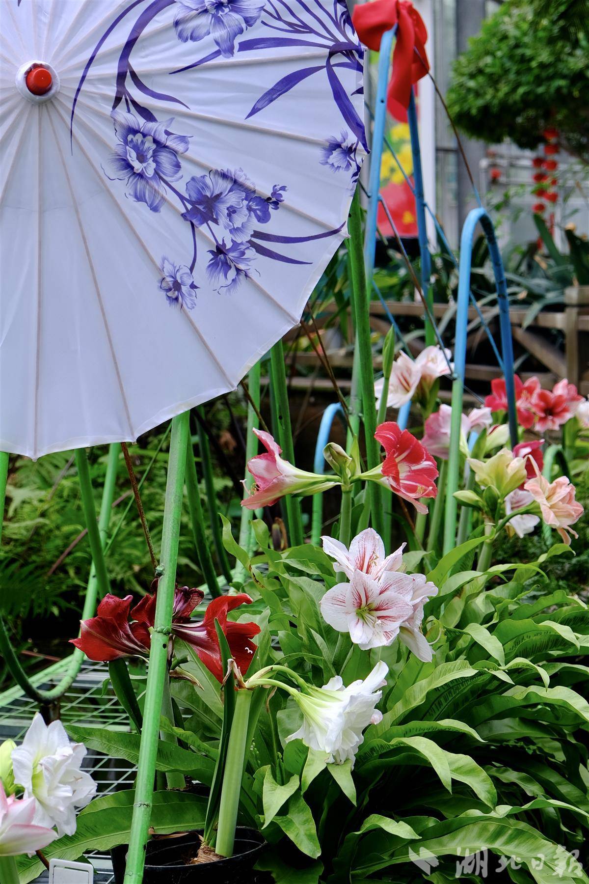 武漢植物園景觀溫室內(nèi),朱頂紅也為國慶增添了喜慶氛圍。