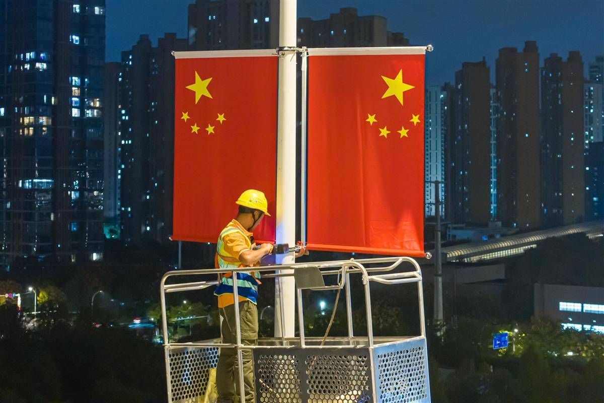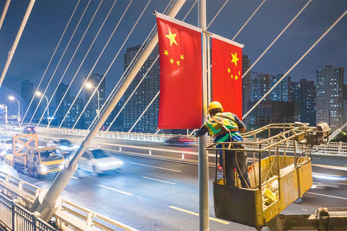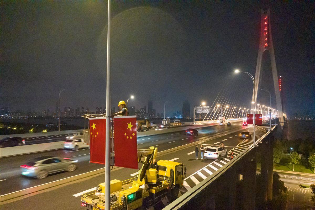 9月25日深夜11時許,在武漢二七長江大橋橋面,城管部門工作人員搭乘高空作業車輛,將一面面五星紅旗懸掛并固定在路燈燈桿上,第二天一早通勤的市民可目睹二七長江大橋一夜之間飄滿“中國紅”。為避免懸掛國旗影響城市主干道安全暢通,城管部門特意選擇深夜車流量最少的時刻進行作業。