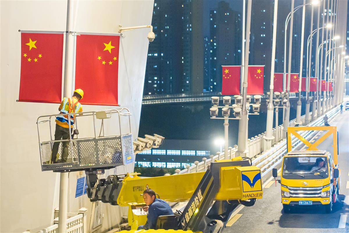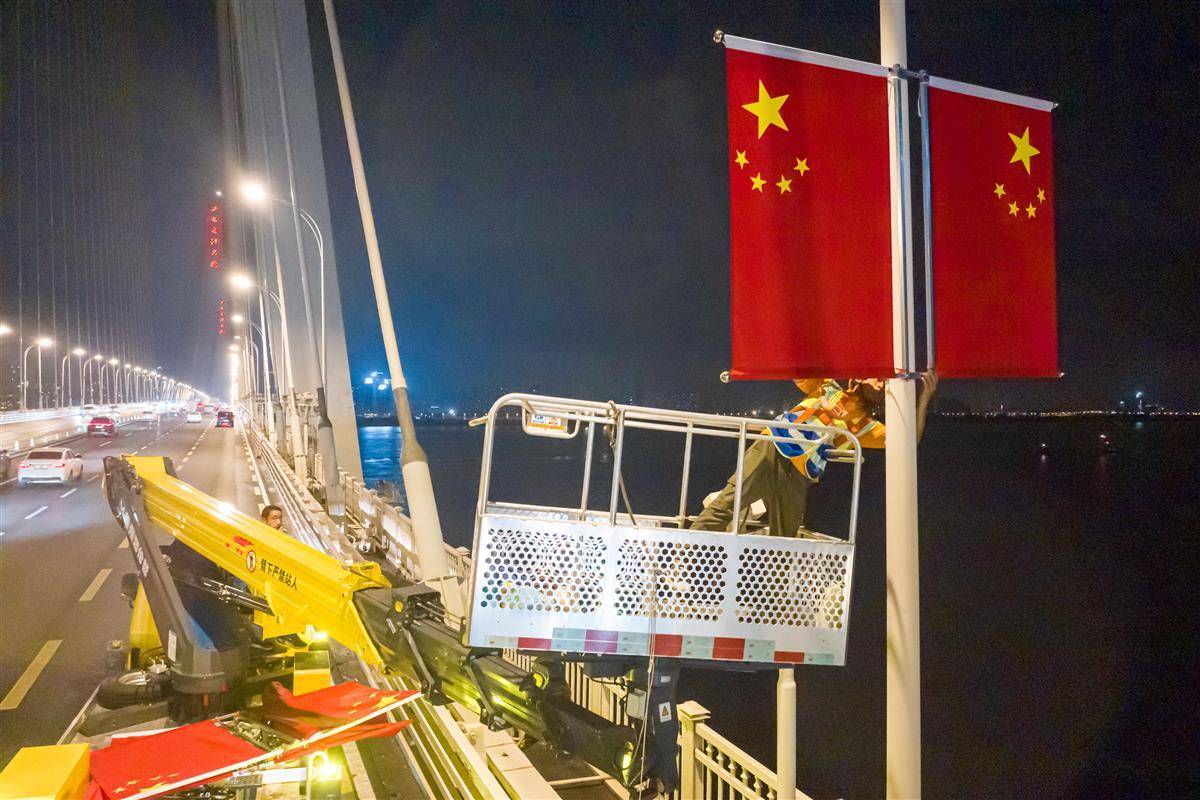 9月25日深夜11時許,在武漢二七長江大橋橋面,城管部門工作人員搭乘高空作業車輛,將一面面五星紅旗懸掛并固定在路燈燈桿上。(湖北日報全媒記者 任勇 通訊員 馮夏雪 吳雪婷 攝)