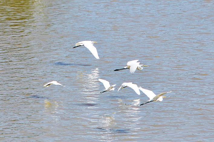9月24日,十堰市鄖陽湖國家濕地公園,鷺鳥在湖面覓食。連日來,受強降雨影響,鄖陽湖國家濕地公園水位回升,吸引大批鷺鳥來此覓食。