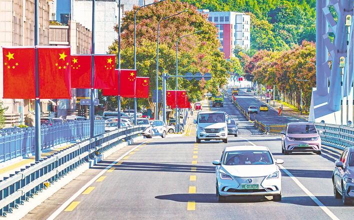 9月24日,宜昌江南大道上,鮮艷的五星紅旗在盛開的欒樹叢間隨風(fēng)舒展,紅白相映、燦爛奪目,成為一道亮麗的風(fēng)景線,傳遞出對祖國的美好祝福。(湖北日報(bào)全媒記者 劉曙松 攝)