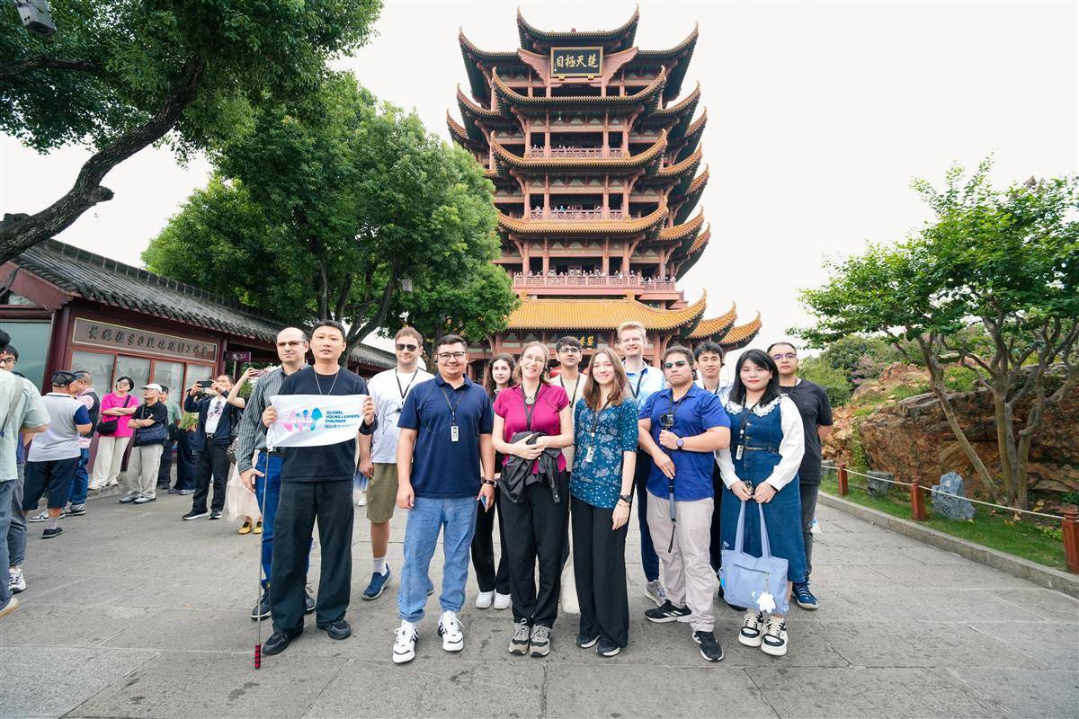 國際青年代表在武漢黃鶴樓前合影留念。(荊州市委宣傳部供圖)