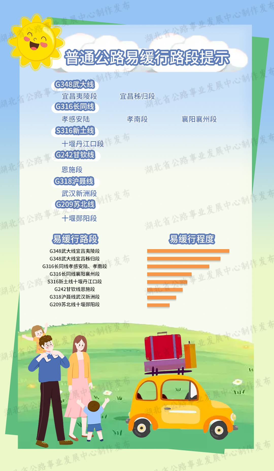普通國省干線擁堵緩行主要集中在G348武大線宜昌夷陵段,宜昌秭歸段,G316長同線孝感安陸、孝南段,襄陽襄州段,S316新土線十堰丹江口段,G242甘欽線恩施段,G318滬聶線武漢新洲段,G209蘇北線十堰鄖陽段。