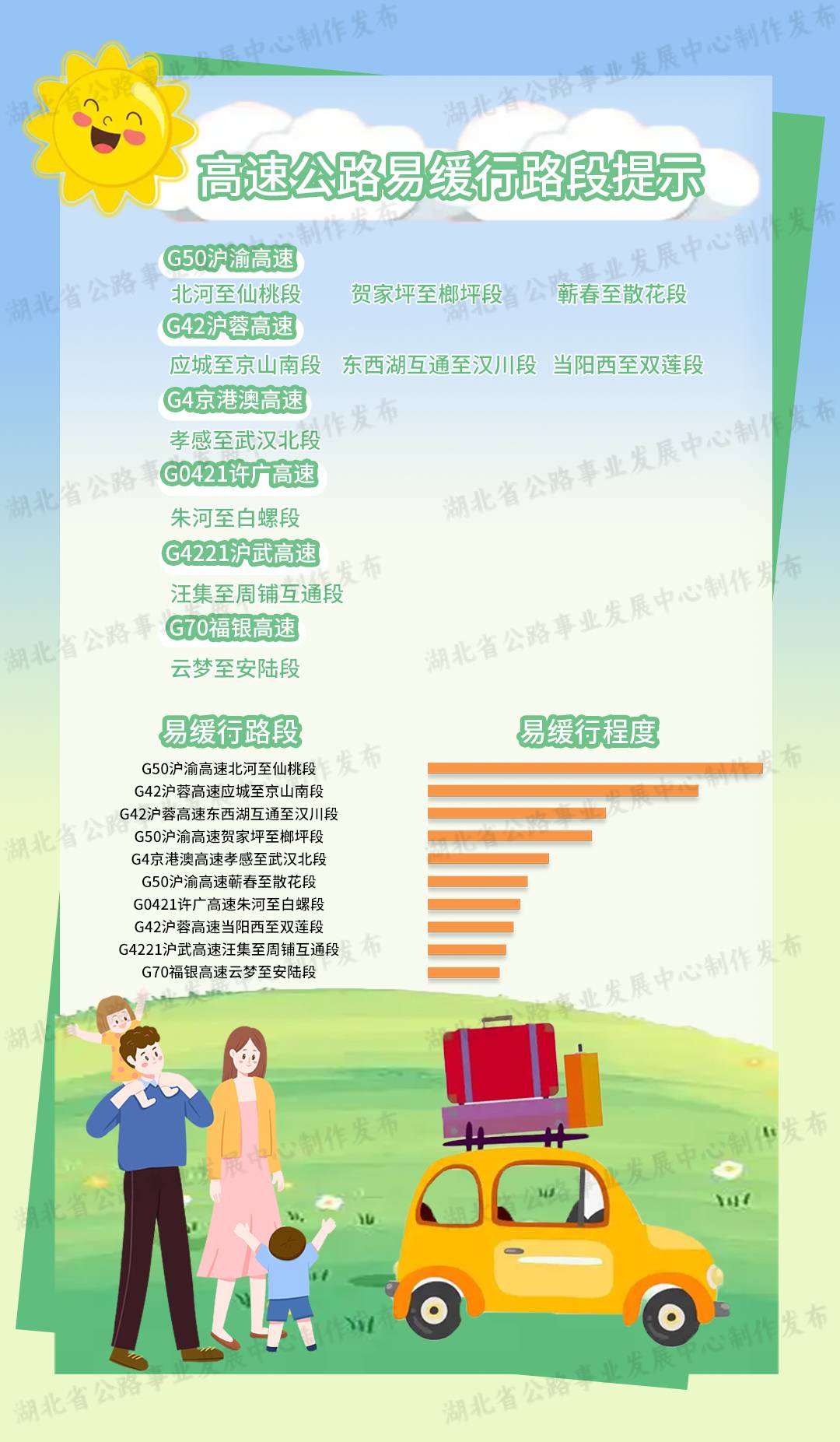 高速公路擁堵緩行主要集中在G50滬渝高速北河至仙桃段、賀家坪至榔坪段、蘄春至散花段,G42滬蓉高速應城至京山南段、東西湖互通至漢川段、當陽西至雙蓮段,G4京港澳高速孝感至武漢北段,G0421許廣高速朱河至白螺段,G4221滬武高速汪集至周鋪互通段,G70福銀高速云夢至安陸段。