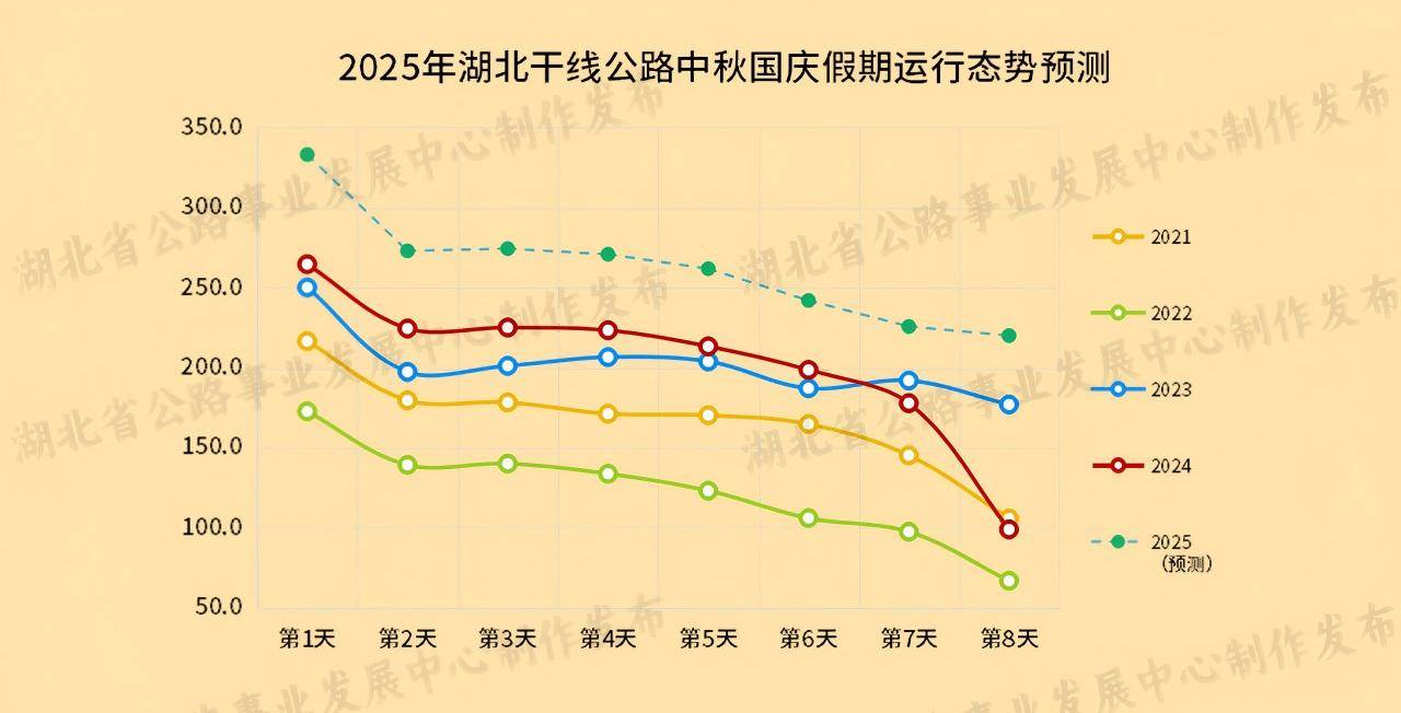根據往年國慶假期流量數(shù)據分析,預計路網整體流量將呈現(xiàn)“前高后緩、峰值突出、逐日下降、返程分散”態(tài)勢。9月30日,部分公眾選擇提前出行,路網流量提前進入高位,預計16時起車流量將逐漸增長,以武漢及各市州為中心向周邊縣市發(fā)散。10月1日-2日,出游車流量急劇上升,當日流量為國慶期間流量峰值。10月3日-5日,流量略微趨緩,但仍處于高位運行。10月6日-7日,部分公眾提前返程,錯峰返程流量較大,主要由周邊縣市向大中型城市匯聚,預測10月7日為返程高峰。10月8日,公眾錯峰返程意識增強,路網流量仍處于高位運行,但總體相對平穩(wěn),擁堵程度低于返程高峰。
