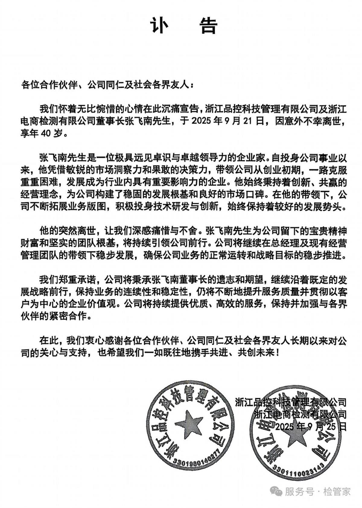 9月25日晚,浙江品控科技管理有限公司及浙江電商檢測有限公司發布訃告,董事長張飛南先生于2025年9月21日,因意外不幸離世,享年40歲。