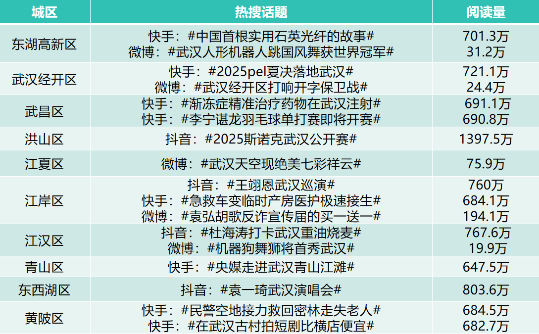 民生保障熱情暖心。8月,武漢各城區在醫療創新、生態治理、司法便民、教育擴容等多維度深入探索,彰顯城市發展的民生溫度。全球首個用于漸凍癥的精準治療藥物在位于武昌區的武漢大學人民醫院完成華中地區首針注射,該進展獲得人民日報、中國新聞網、環球網、光明網、湖北日報等央省媒體廣泛報道,累計轉發量逾200條次;快手話題#漸凍癥精準治療藥物在武漢注射#播放量達691.1萬次,體現了輿論對武漢醫療技術實力的廣泛認可。與此同時,中國新聞網、科技日報、荊楚網等媒體發布《工業銹帶變身生態秀場 武漢青山江灘煥新顏》等報道,聚焦青山區將昔日工業遺址改造為生態綠洲、市民休閑空間,快手話題#央媒走進武漢青山江灘#獲647.5萬播放量,反映了網民對于青山區城市更新成效的高度點贊。在基層治理領域,各城區創新舉措同樣獲得了輿論的持續好評。人民網報道《武漢東西湖法院“法院+綜治中心”以調解促鄰里和諧》,關注東西湖區法院通過派駐法官至綜治中心,實現“小事不出社區”的治理效能。金臺咨詢報道《武漢黃陂新增7555個基礎教育學位 推動城鄉教育優質均衡發展》,聚焦黃陂區以教聯體共建推進“新校即名校”建設,以及辦好人民滿意的教育的堅定決心。