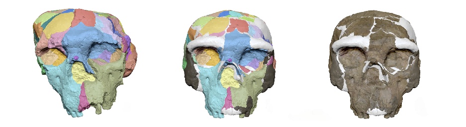 由山西大學、中國科學院古脊椎動物與古人類研究所、復旦大學、云南省文物考古研究所和倫敦自然歷史博物館等單位組成的聯合科研團隊,采用高精度CT掃描與結構光表面掃描技術,清晰識別出“鄖縣人”2號頭骨化石中的裂隙、礦物填充和未變形骨片,隨后通過創新的數字重建方法,根據解剖結構和幾何形態學標志點,以虛擬方式完成了頭骨的精細拼接。