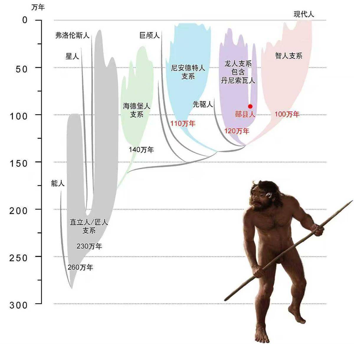 研究團隊以“鄖縣人”作為關鍵校準點,構建出全新的人屬系統演化樹,再借助貝葉斯支端定年法與簡約性分析,推算出各個人類支系的分化時間。研究發現,智人、龍人和尼安德特人這三支分化發生得非常早,“鄖縣人”并非直立人,而是與丹尼索瓦人密切相關的龍人支系的早期代表。