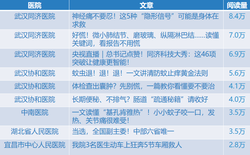 8月,多家醫院聚焦醫療技術的臨床轉化和應用推廣,展現醫療創新如何惠及普通患者。湖北省人民醫院發布《顯著改善心梗救治效果!這個“湖北新策略”,獲國際認可,將造福千萬人》,取得1.5萬閱讀量,重點突出該項創新技術對心梗救治效果的實際改善,強調其普惠價值。該院消化內科于紅剛教授成功當選中華醫學會消化內鏡學分會副主任委員,同時是中部六省唯一當選消化內鏡專家,相關文章《當選,全國副主委!中部六省唯一》收獲3.5萬閱讀量,彰顯學科領軍地位的同時,也體現專家團隊對醫療技術推廣的貢獻。中南醫院成功完成高難度手術,《直腸癌復發侵犯盆腔!武漢專家8小時高難度手術助其重獲新生》獲極目新聞等多家媒體轉載。該院還開展“30個專家團隊,免費義診1個月”活動,相關文章收獲1.9萬閱讀量,讓優質醫療資源直接惠及民眾。十堰市人民醫院實現重大突破,《見證!這個全球首例寶寶“回家”!還有個好消息……》取得1.2萬閱讀量,報道聚焦技術創新如何讓特殊病例患者重獲健康,突出醫療進步的普惠意義。從傳播亮點看,8月我省醫院的技術創新報道注重突出臨床實用價值和普惠意義,通過具體案例展示醫療技術如何切實改善患者生活質量,讓高端醫療技術接地氣、惠民生。
