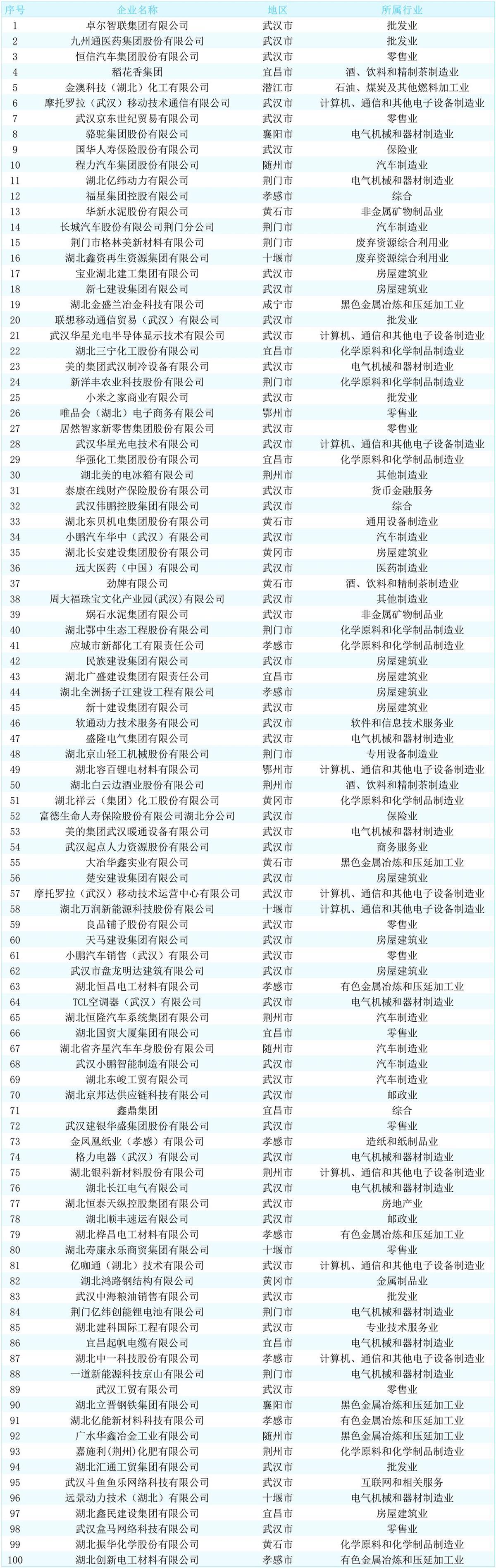 百?gòu)?qiáng)榜單排在前十位的企業(yè)是:卓爾智聯(lián)集團(tuán)有限公司、九州通醫(yī)藥集團(tuán)股份有限公司、恒信汽車集團(tuán)股份有限公司、稻花香集團(tuán)、金澳科技(湖北)化工有限公司、摩托羅拉(武漢)移動(dòng)技術(shù)通信有限公司、武漢京東世紀(jì)貿(mào)易有限公司、駱駝集團(tuán)股份有限公司、國(guó)華人壽保險(xiǎn)股份有限公司、程力汽車集團(tuán)股份有限公司。