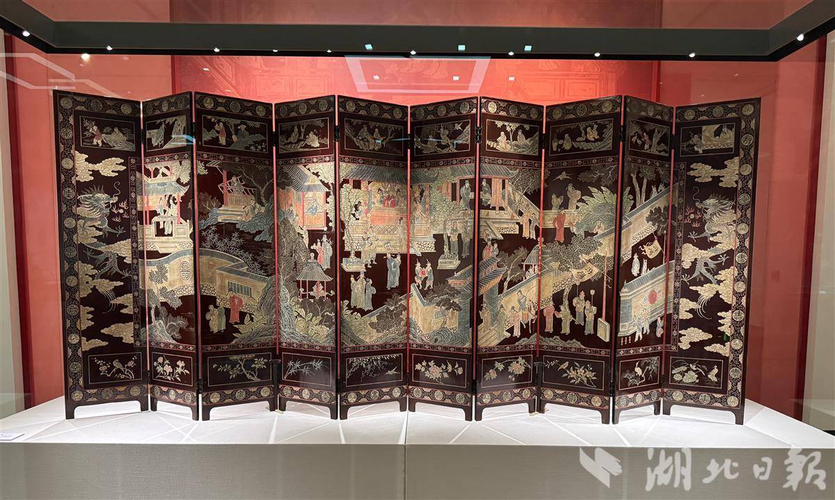 湖北日報訊(記者孫凌)9月26日湖北省博物館“光彩于文——中國漆器藝術”特展開展。來自舊金山亞洲藝術博物館藏的“清康熙(1662-1722年)的款彩郭子儀慶壽圖十聯桌屏”圖案精美、色彩鮮艷、人物形象生動。屏風堂心刻“郭子儀慶壽圖”,兩邊屏刻游龍,下窗為花卉、鶴鳥紋。上窗內刻人物,就是一個生動有趣的人物故事圖。觀眾仿佛看到,古人也愛吃席湊熱鬧。“郭子儀慶壽圖”是廣受民間歡迎的祝壽題材,也是古代工藝品中常見的裝飾題材。對郭子儀祝壽故事的喜愛表達了人們對于富貴長壽、人丁興旺、運勢昌隆的美好憧憬。