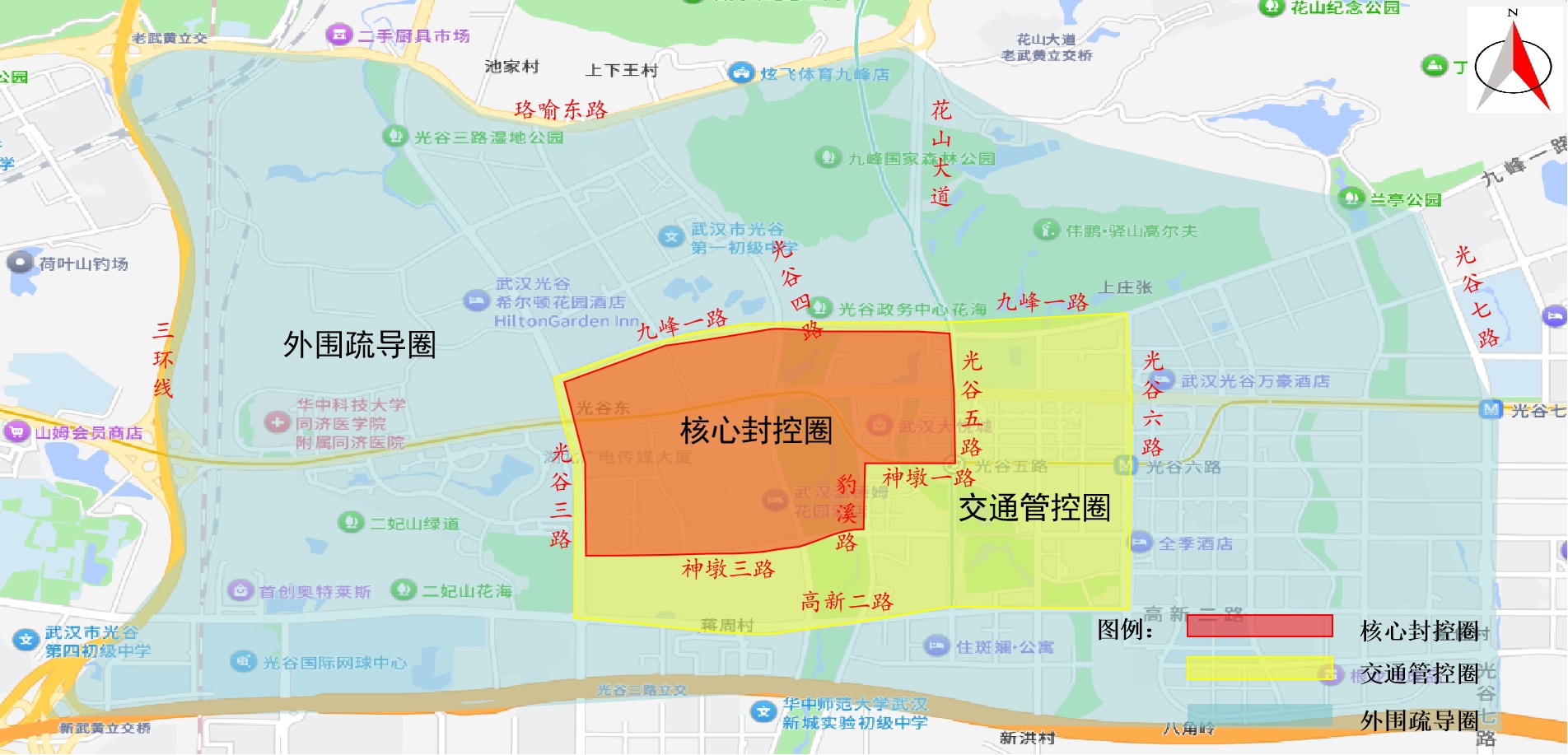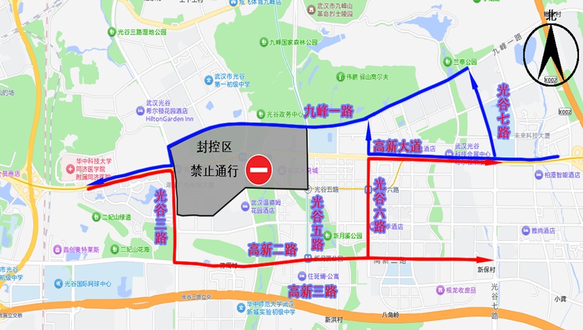 四、需通行上述路段的機動車,出城方向可經三環線、森林大道、花山大道或光谷三路、高新二路、光谷六路、光谷七路等相關道路繞行,進城方向可經光谷六路、光谷七路、九峰一路、光谷三路、森林大道等相關道路繞行。