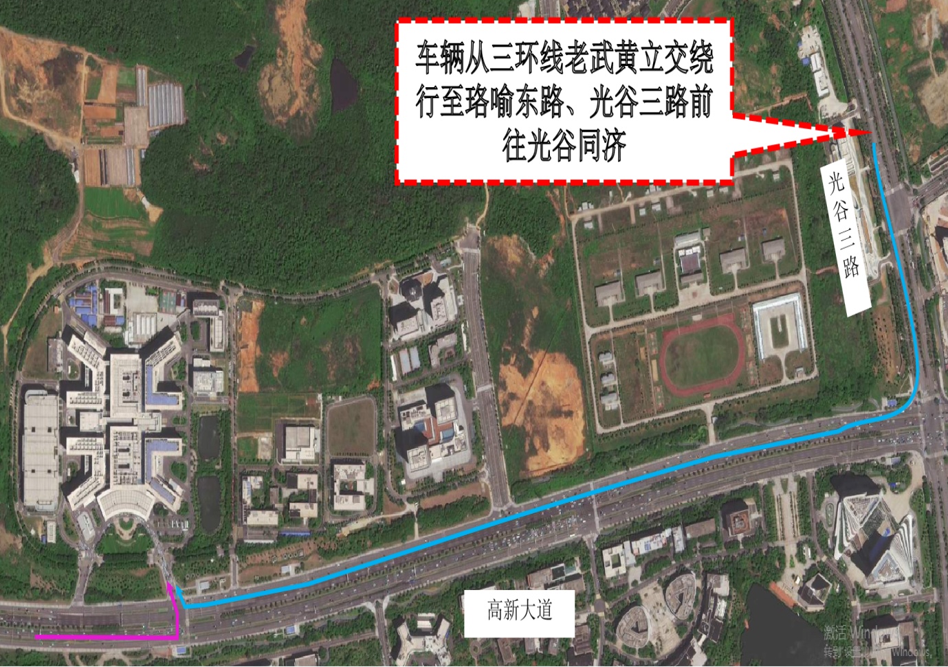 前往光谷同濟醫院的車輛建議從三環線老武黃立交繞行至珞瑜東路、光谷三路前往。