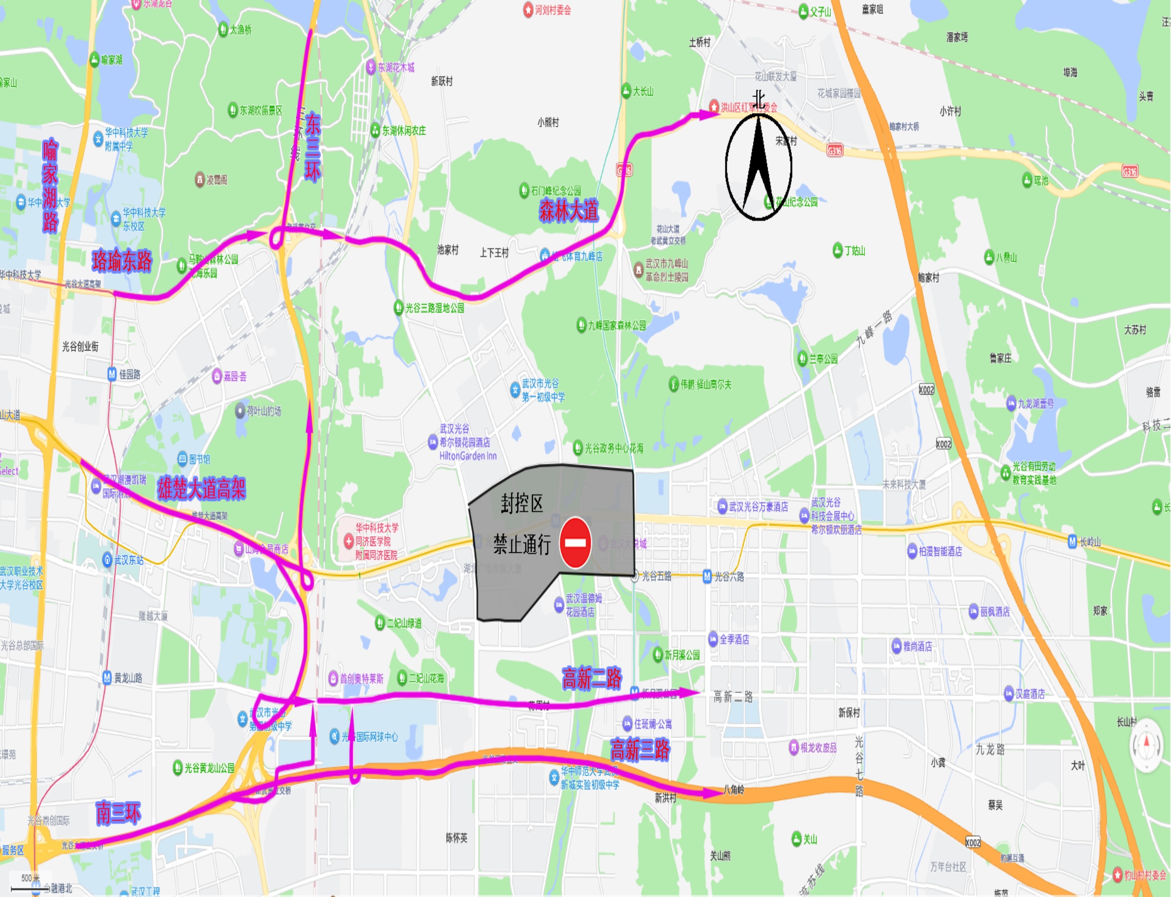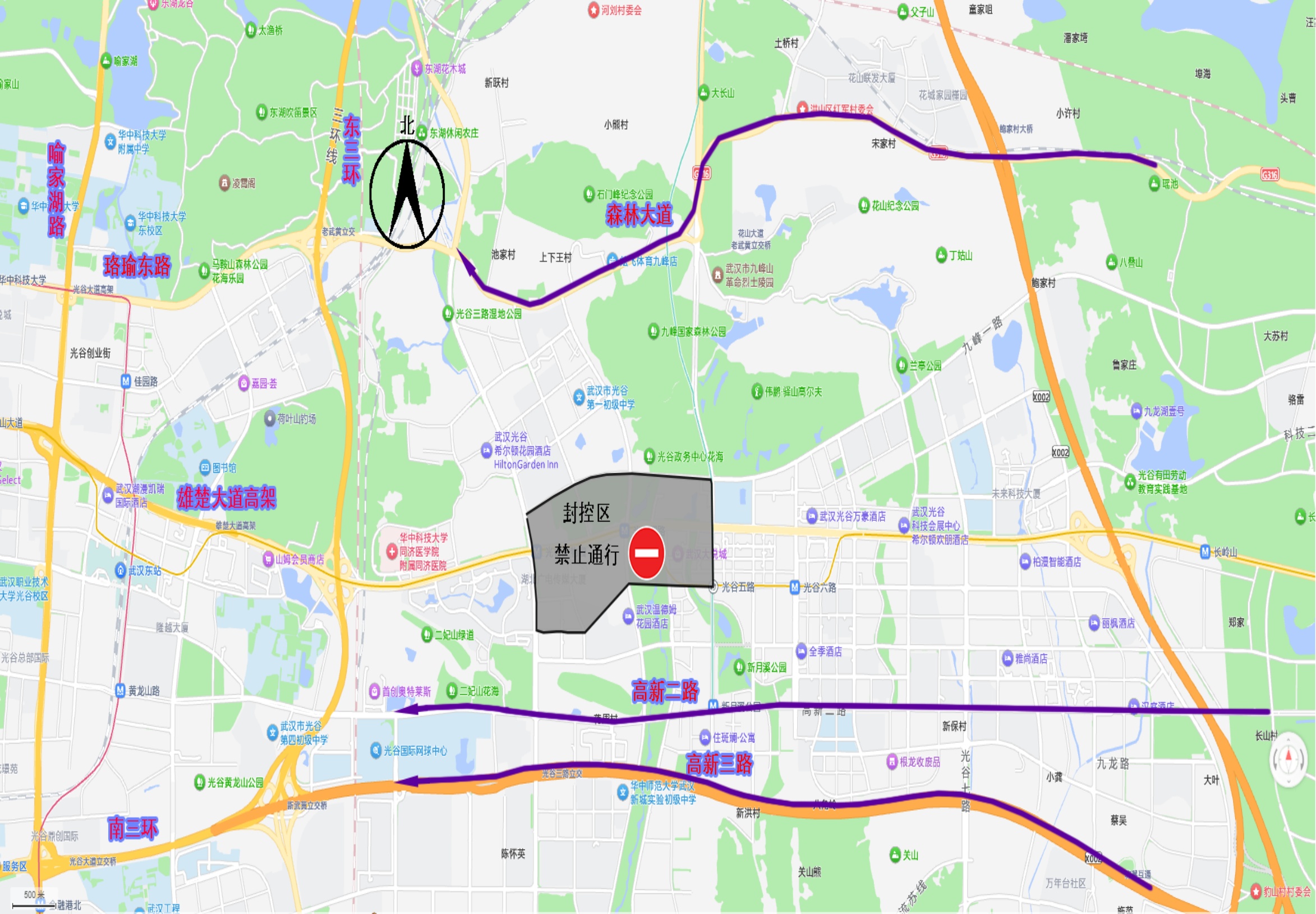 東湖高新區東向西車輛建議從森林大道、高新二路、高新三路繞行。