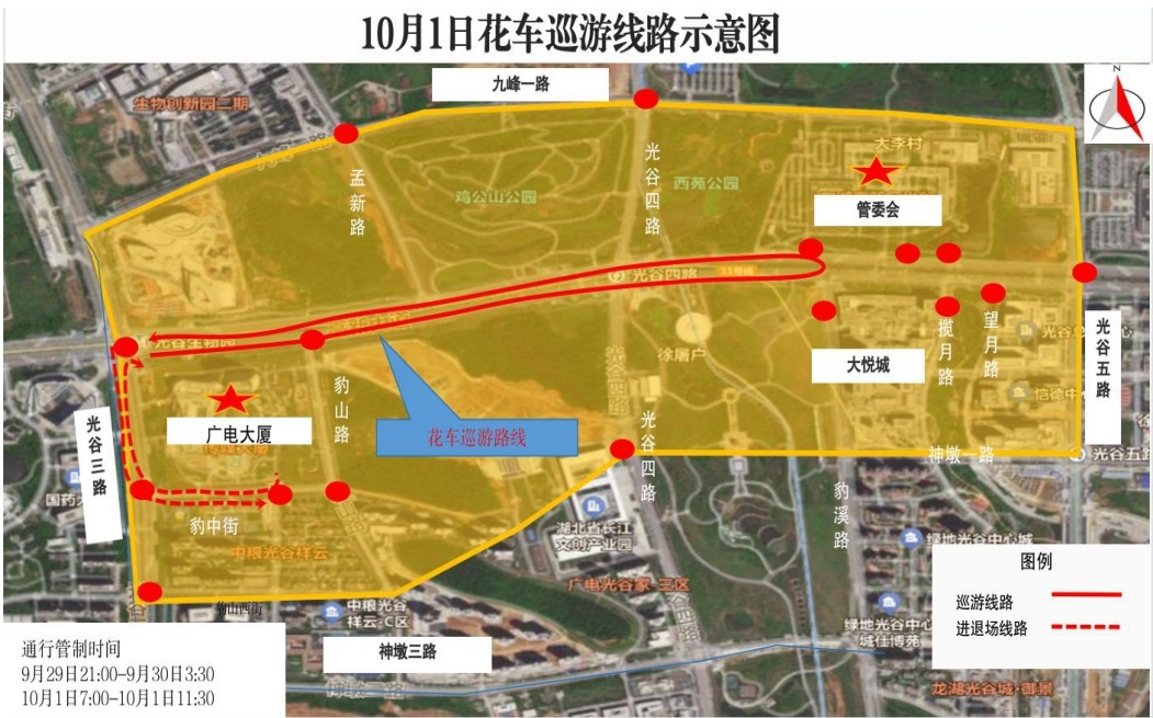 三、9月29日21:30至9月30日3:30,10月1日7:30-11:30,高新大道(光谷三路至光谷五路)禁止車輛通行。