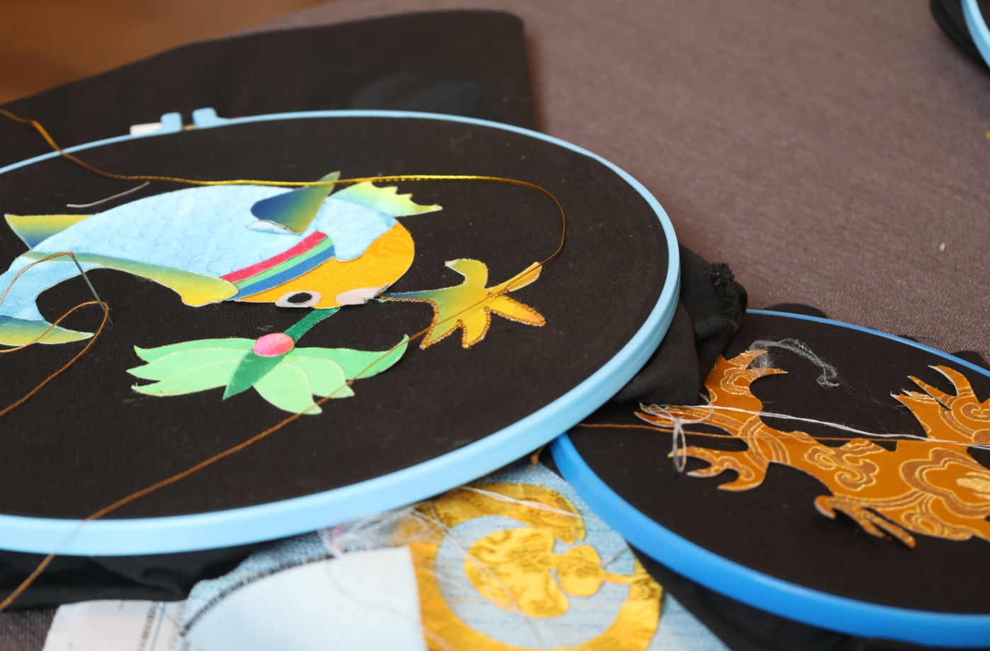 陽(yáng)新布貼作為國(guó)家級(jí)非物質(zhì)文化遺產(chǎn),源于百姓日常生活,以黑色或深藍(lán)布料為底,用五彩邊角布片拼貼出吉祥圖案,承載著楚地深厚的民俗文化與女性智慧。本次展覽以“歷史與文化”“技藝與流程”“生活與應(yīng)用”“創(chuàng)新與未來”四大板塊為主線,通過虎頭帽、五毒肚兜、婚嫁帳檐、壽字椅墊等百余件實(shí)物,生動(dòng)呈現(xiàn)陽(yáng)新布貼從誕生、婚慶到壽辰的生命禮贊,展現(xiàn)其作為“穿在身上的祝福”的獨(dú)特魅力。