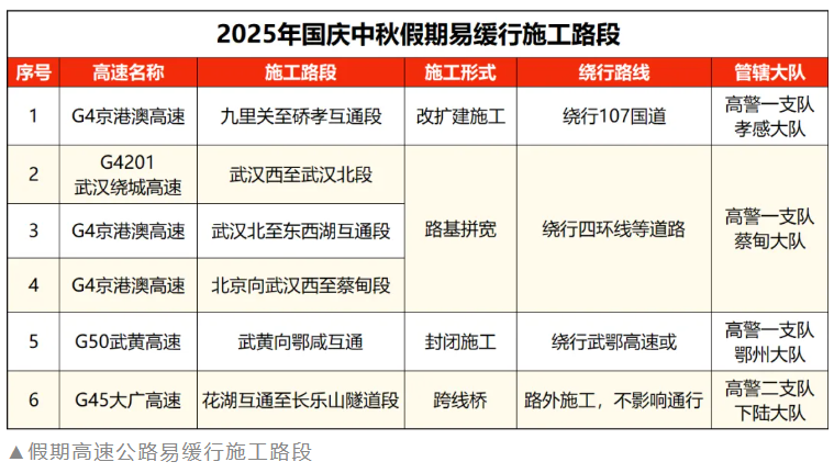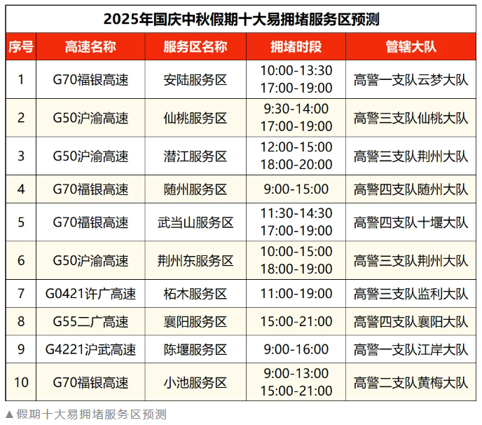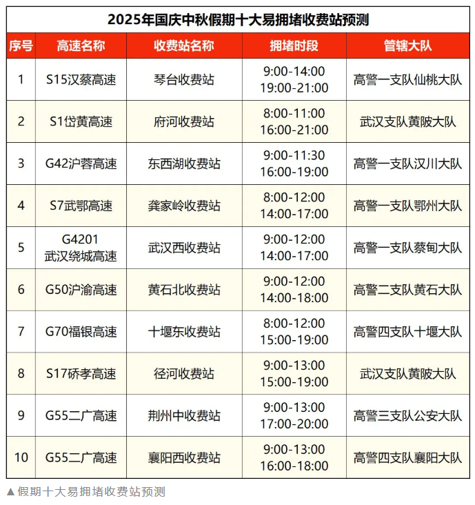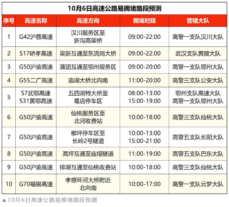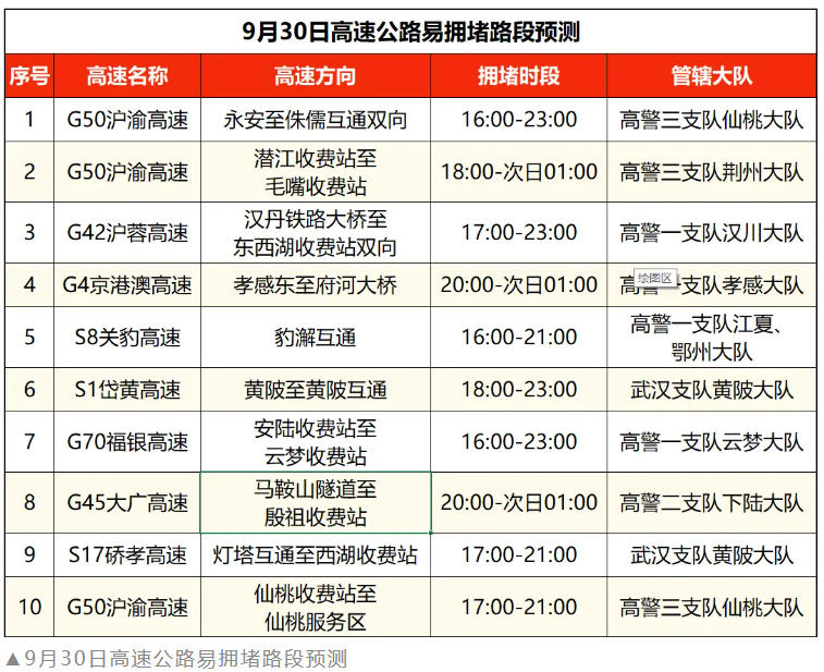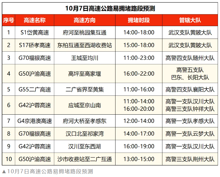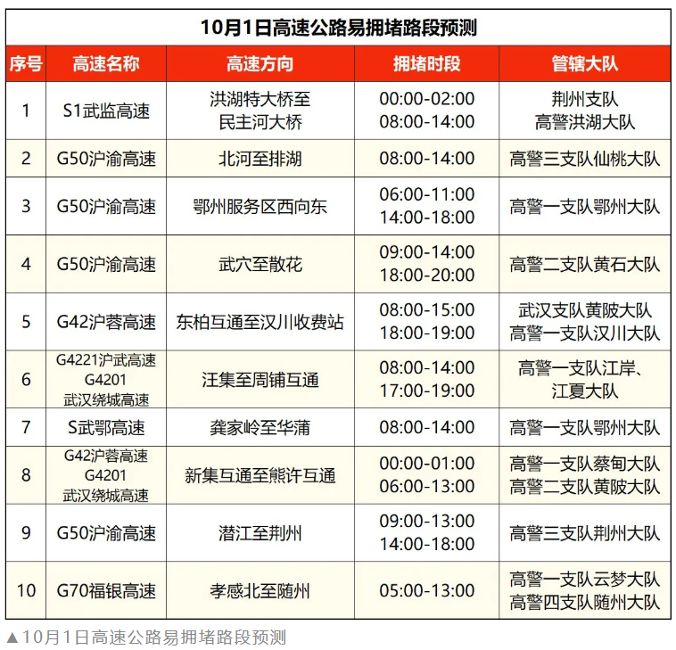 滬蓉高速漢川、當陽、鐘祥、黃陂段,滬渝高速仙桃、荊州、長陽、黃石、巴東、鄂州、恩施段,福銀高速云夢、隨州、十堰段,京港澳高速孝感段,武鄂高速鄂州段,武漢繞城高速江夏、蔡甸段,武監高速武漢段,滬武高速江岸段,二廣高速襄陽段,呼北高速十堰段等高速路段擁堵風險高。