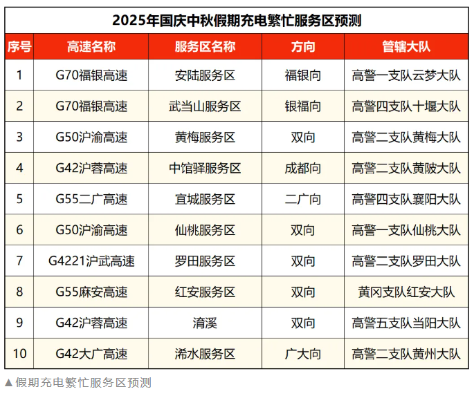 預計今年國慶中秋假期,仍呈集中出行分散返程特點,返程流量相對平穩,假期首日、第六日、第七日高速公路擁堵緩行風險突出。此外,加油、充電設施繁忙服務區車輛排隊易倒灌主線引發事故,進一步加劇擁堵緩行風險。