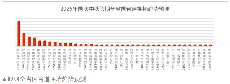 G348國道宜昌段,G242國道、G350國道、G209國道恩施段,G316國道孝感段;S233省道、S339省道恩施段,S108省道武漢段等國省道路段擁堵風險高。