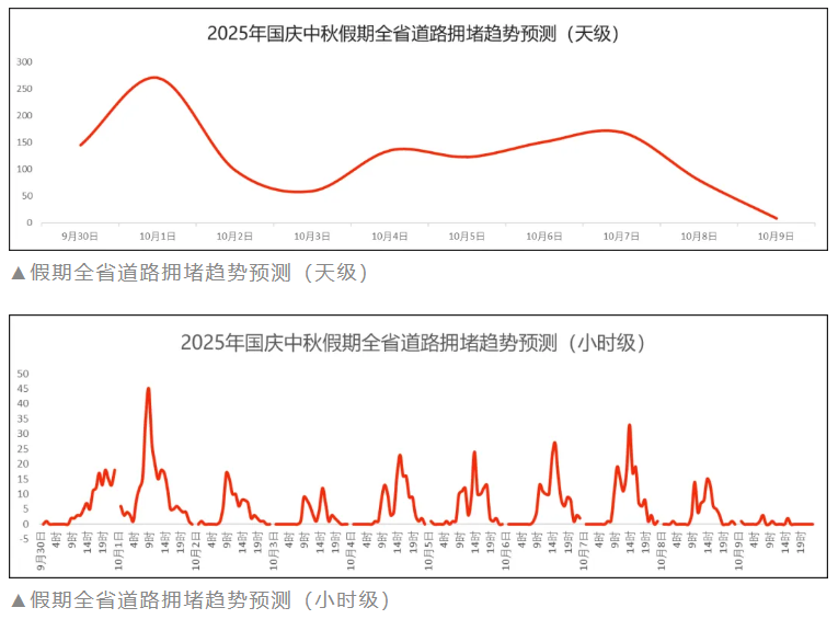 10月1日,出城車流量急劇上升,當日流量為全段假期峰值,上午9時至13時迎來最高峰。10月6日至7日,提前返程和錯峰返程流量大,主要由周邊縣市向大中城市匯聚。10月8日,受錯峰返程意識影響,路網流量較前階段明顯下降,返程高峰相對平穩。10月9日,路網流量逐步恢復常態。