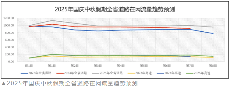 根據近年假期全省道路在網流量態勢分析,預計今年道路日均在網流量將“井噴式”增長,較平日上升約7%~13%,達995~1010萬臺次;高速公路日均在網流量較平日上升約125%~130%,達150~156萬臺次。10月1日,全省流量達到峰值,約1140萬臺次左右,高速公路流量峰值或將突破200萬臺次。