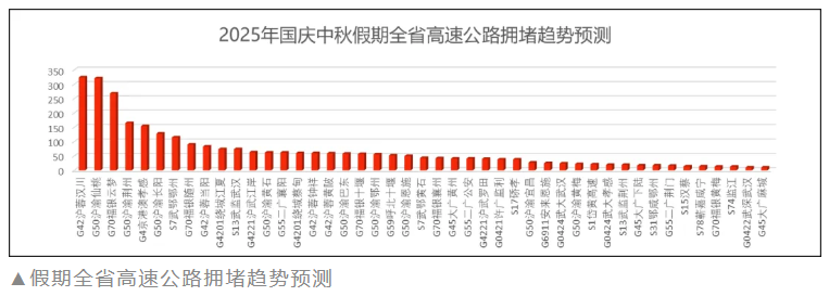 結合近年假期出行規律,9月30日部分群眾選擇提前出行,路網流量提前進入高位,預計16時起車流量將逐漸增長,以武漢及各市州為中心向周邊縣市發散。