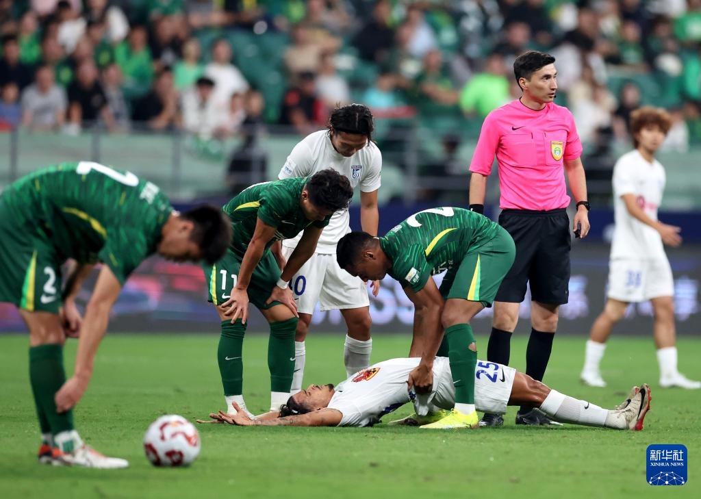9月26日,北京國安隊球員達萬(前右二)幫助受傷的大連英博海發(fā)隊球員佩尼亞(下)。