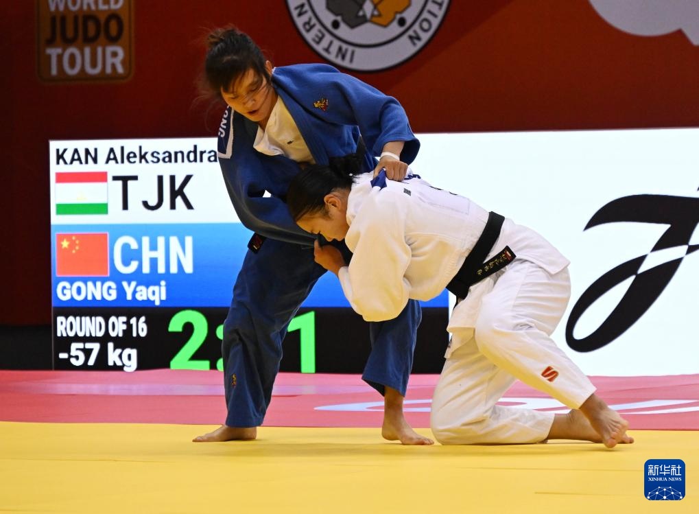 9月26日,中國選手鞏亞琦(左)與塔吉克斯坦選手亞歷山德拉在女子57公斤級八分之一決賽中。最終,鞏亞琦晉級下一輪。