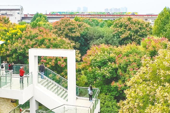 9月26日,武漢地鐵1號線竹葉海站外,彩色涂裝的地鐵列車與高架外絢爛的欒樹構成一幅秋日美景畫——粉紫漸變的欒樹果實如珠簾般垂掛,與彩色主題列車相映成趣,明艷色彩碰撞出強烈視覺沖擊。不少市民駐足拍攝,流連忘返。