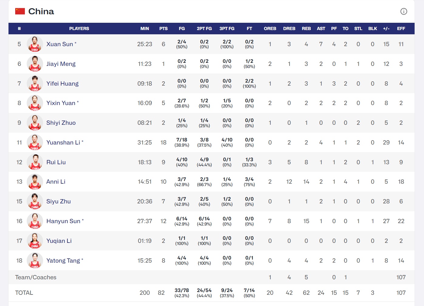 本場比賽中國隊的得分王依然是李沅珊,她第一節(jié)雖然只得3分,但第二節(jié)獨得12分,一手引領(lǐng)了中國隊的大反擊。最終她在三分線外10投4中,砍下全場最高的18分。臨危受命改打中鋒的大前鋒孫晗昀也分外搶眼,拿到12分15籃板的兩雙。另一名內(nèi)線球員李安妮也有10分14籃板的兩雙進(jìn)賬。