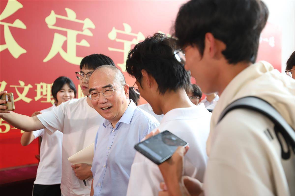 報告剛結束,學生們便涌到主席臺前,爭相與張定宇合影。有人舉著手機踮腳搶位,有人激動地喊著“張教授看這里”,現場既熱鬧又溫暖。張定宇全程笑容滿面,不僅配合大家擺姿勢,還主動和學生自拍,拉近了與學子的距離。
