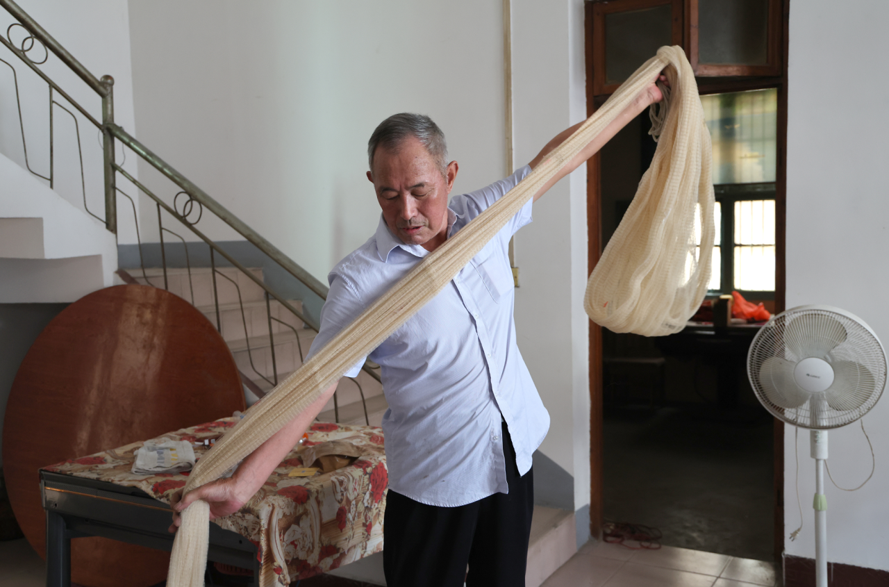 退捕漁民劉成斌向記者展示漁網。記者雷鵬程 攝
