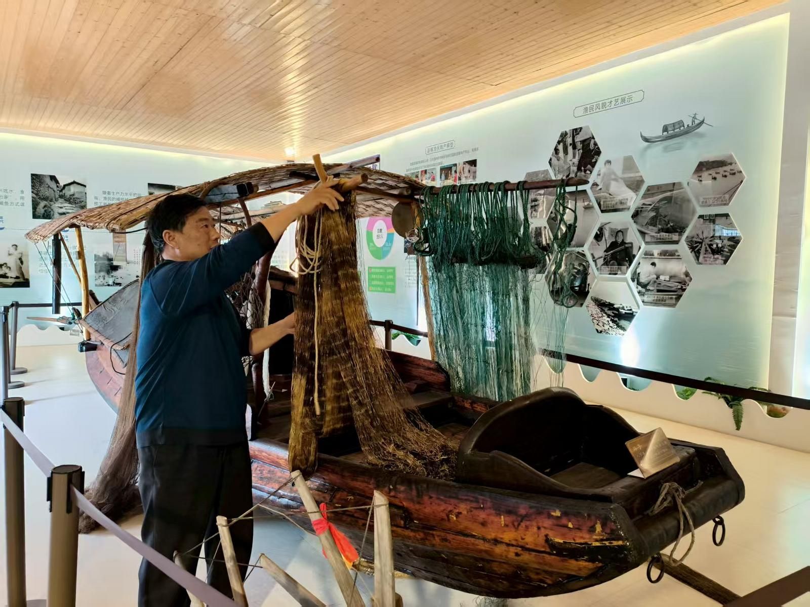 在王雄帶領下,記者來到“白水漁村陳列室”,一艘8米多長的老木船泊在中心位置,船幫上搭著修補過的舊漁網。
