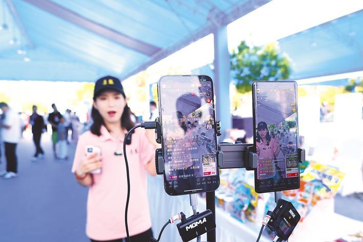 在2025“樂購湖北 金秋潮薈”消費季啟幕現場,某生物公司主播現場直播賣貨。 (湖北日報全媒記者 周鵬 攝)