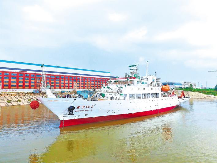 “東方紅2”海洋綜合科考實習船在中船集團武昌造船雙柳廠區下水。(受訪單位供圖)