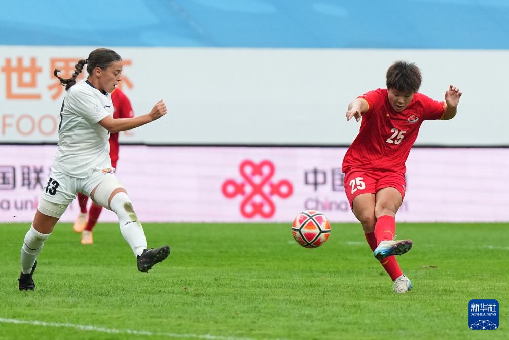 9月27日,上海體育大學(xué)女足球員尹麗紅(左二)在比賽中射門(mén)得分。