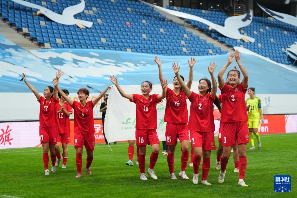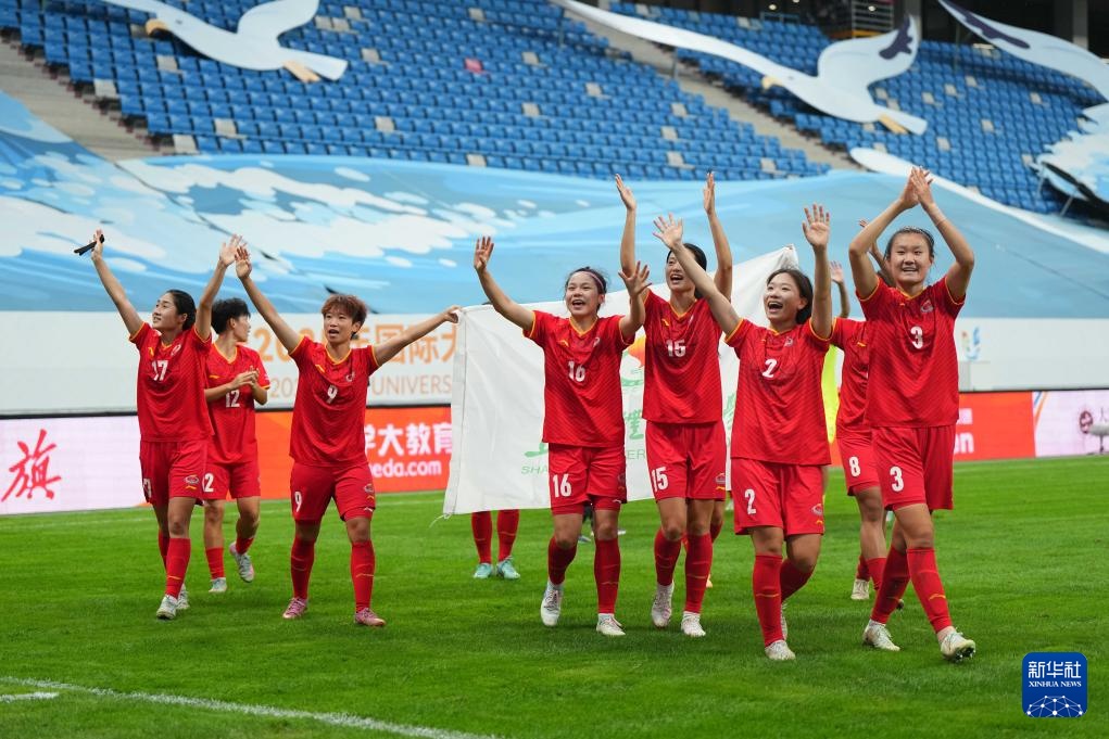 9月27日,上海體育大學(xué)女足球員在賽后慶祝勝利。