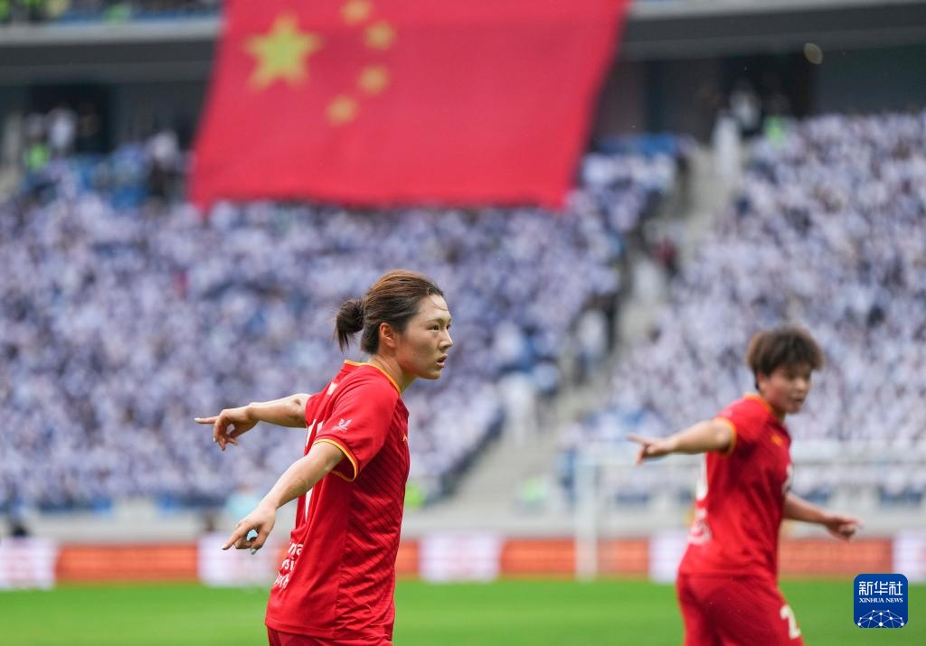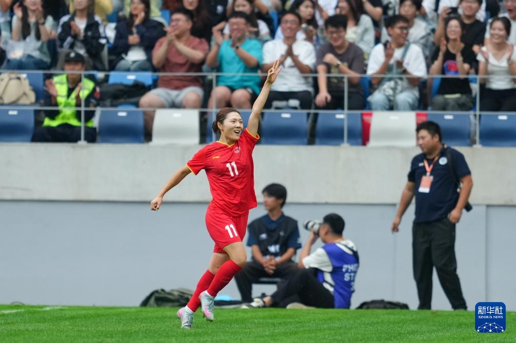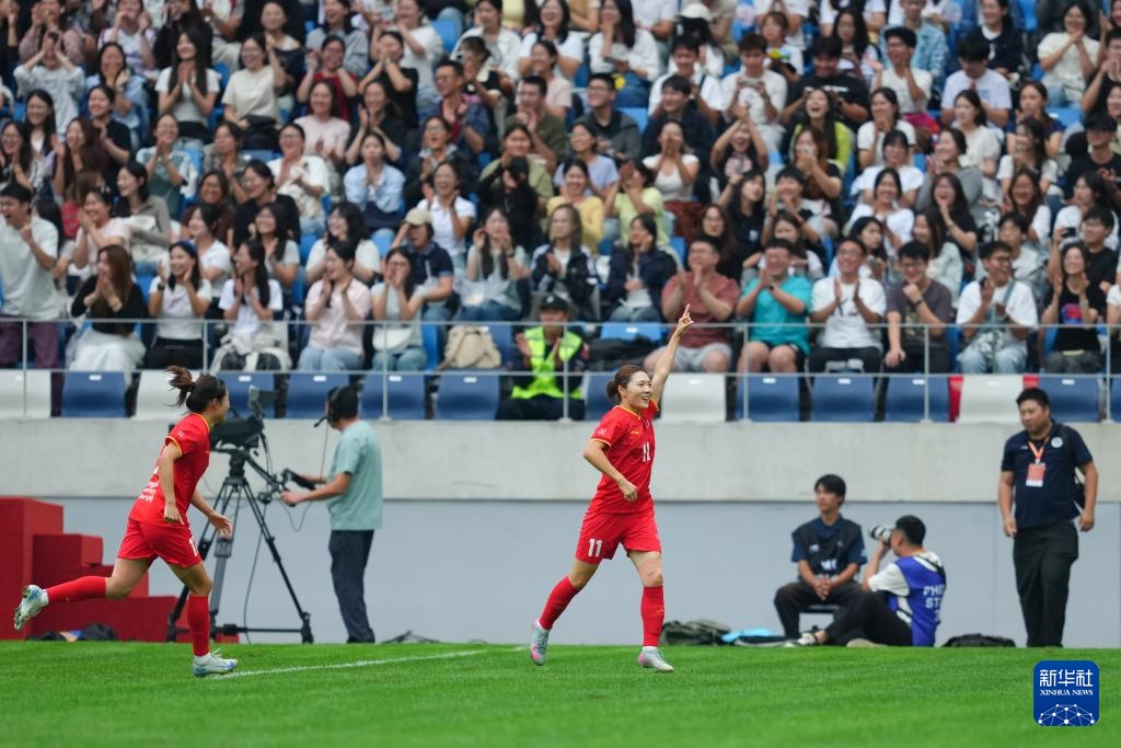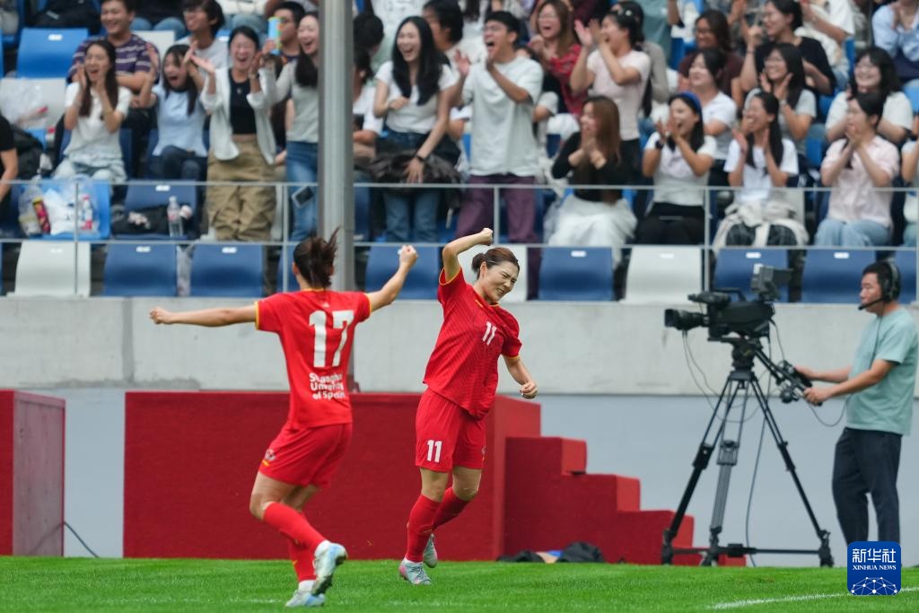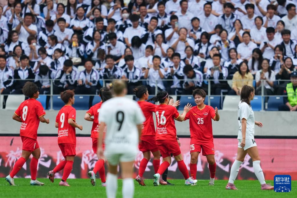 9月27日,上海體育大學(xué)女足球員慶祝進(jìn)球。