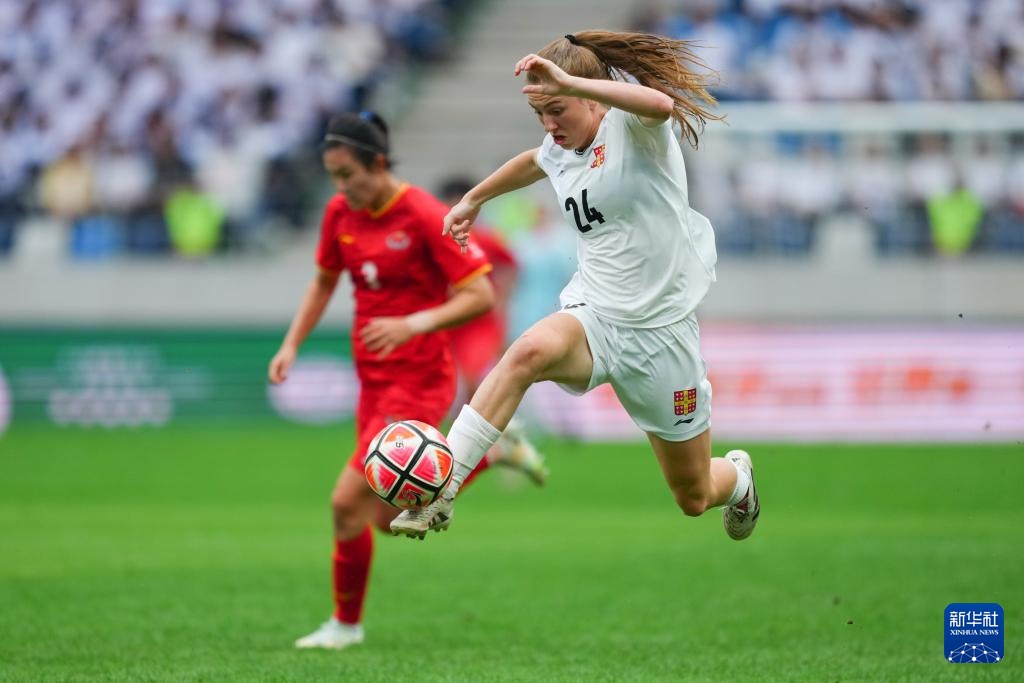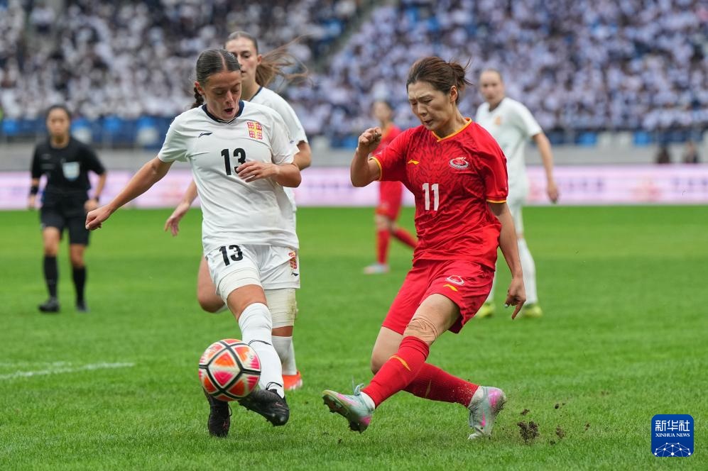9月27日,上海體育大學(xué)女足球員李渟英格(左)在比賽中解圍。