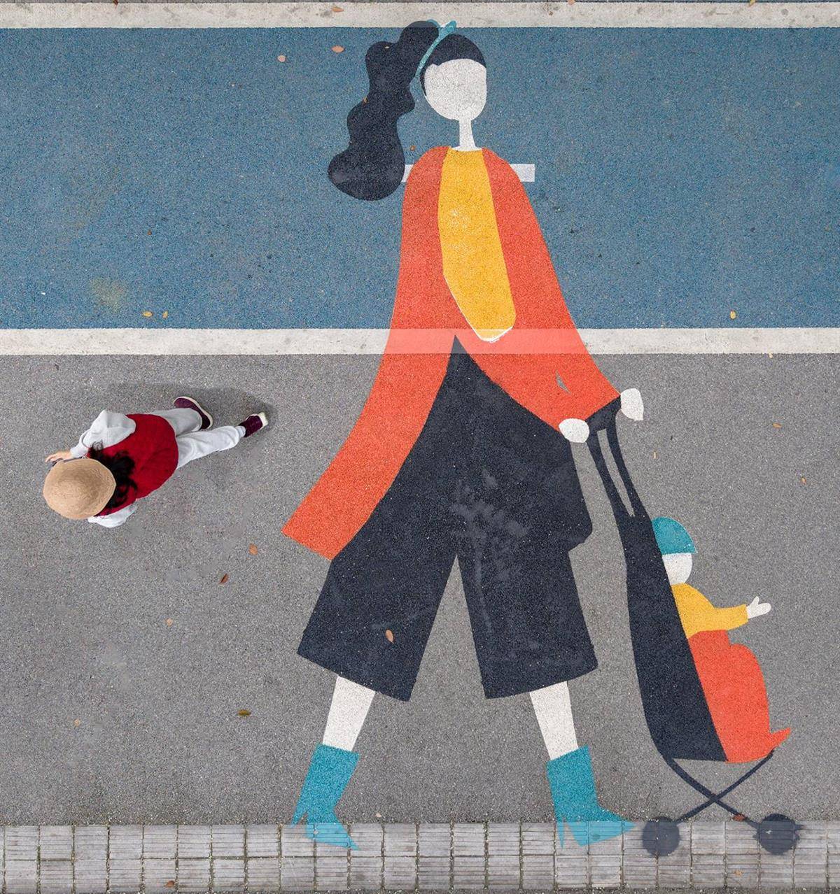 陳嘉麗的《健身步道》組照,拍攝技巧精湛。采用航拍俯拍構(gòu)圖,將健身步道場景完整呈現(xiàn),富有幾何美感;創(chuàng)意融合地面彩繪與真實人物活動,打破現(xiàn)實與藝術(shù)邊界,充滿詼諧活力;對色彩和細節(jié)把控出色,增添生活氣息。